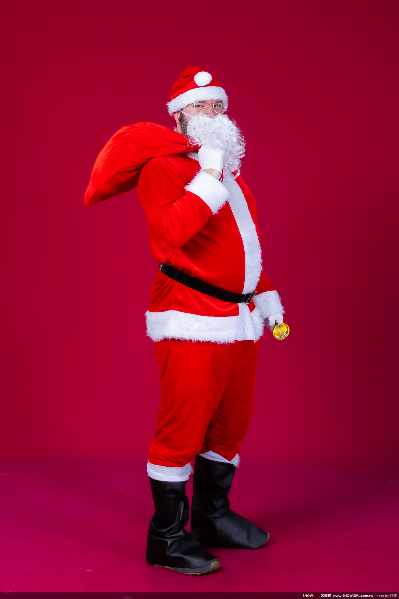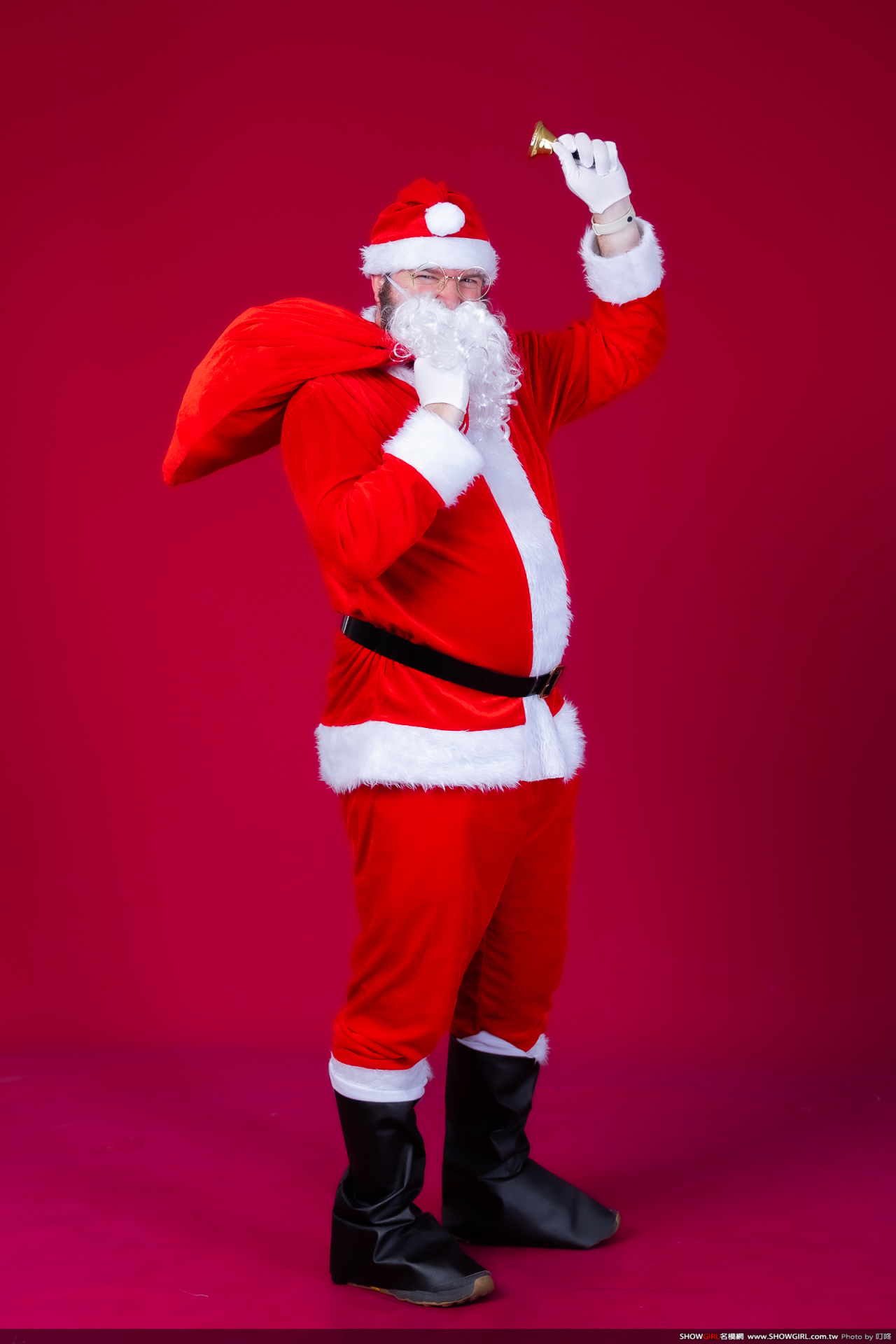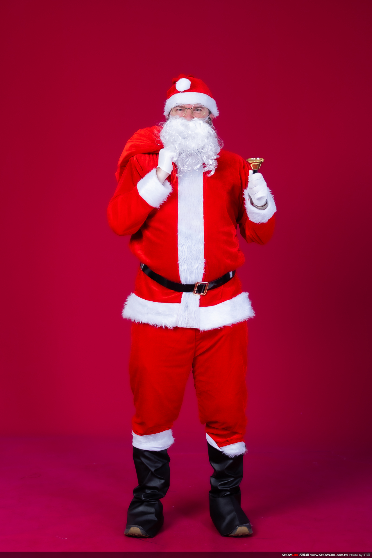 最完整的聖誕老公公服裝,包括:上衣、褲子、腰帶、帽子、手套、假髮、鬍子、袋子、眼鏡、鈴噹、鞋套等。